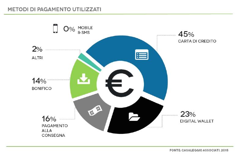 Dall’indagine pubblicata nel Rapporto Ecommerce 2015 della Casaleggio Associati, risulta la carta di credito il metodo di pagamento più comune, utilizzata nel 45% degli acquisti on line.